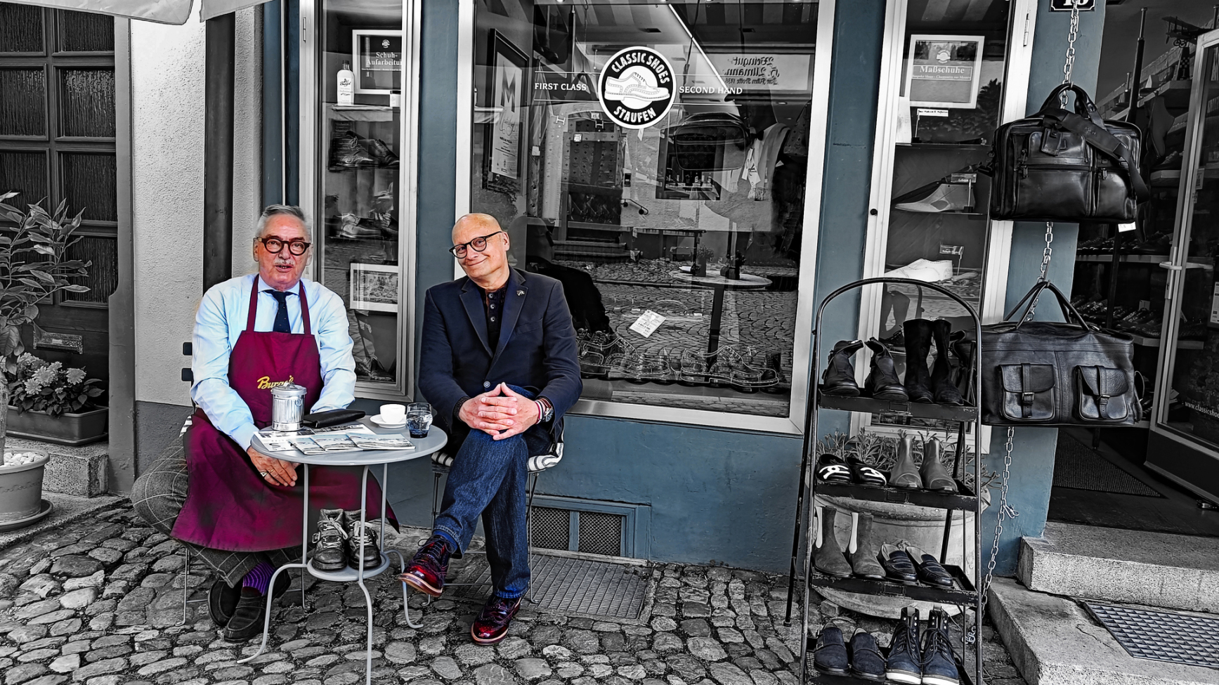 Der Grand-Seigneur von "Classic Shoes Staufen", Bernd Herkenrath und Espresso-Gast Ralf Gérard Bender