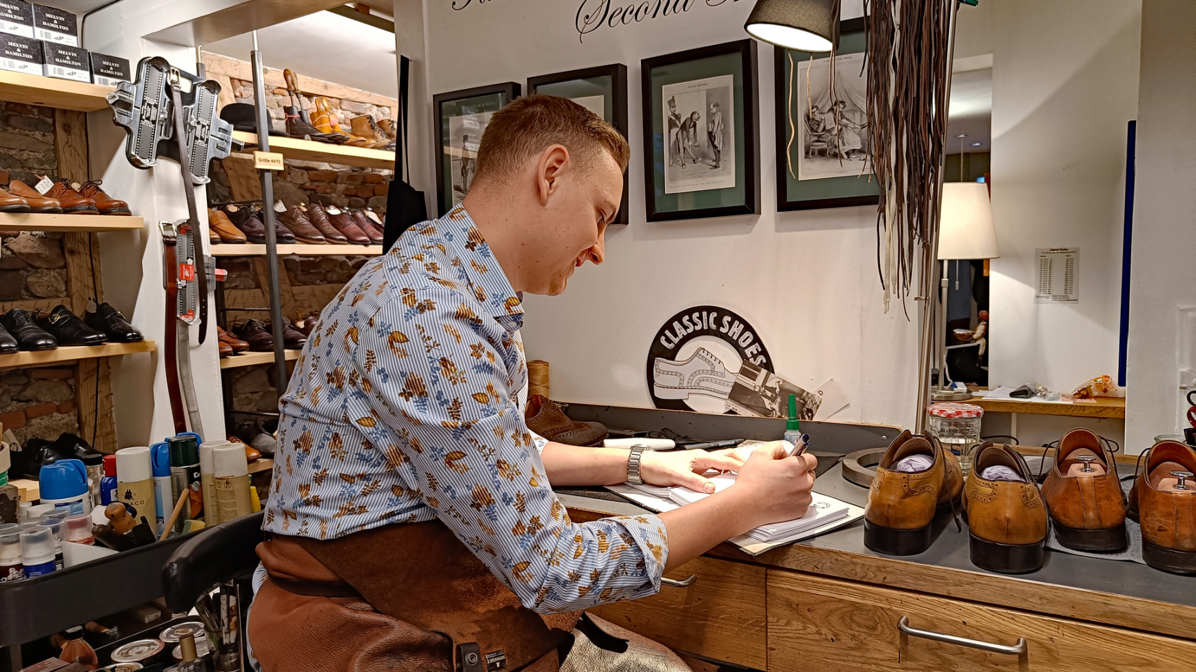 Schumacher-Meister und Virtuose Markus Winschuh von "Classic Shoes Staufen" bei der Arbeit
